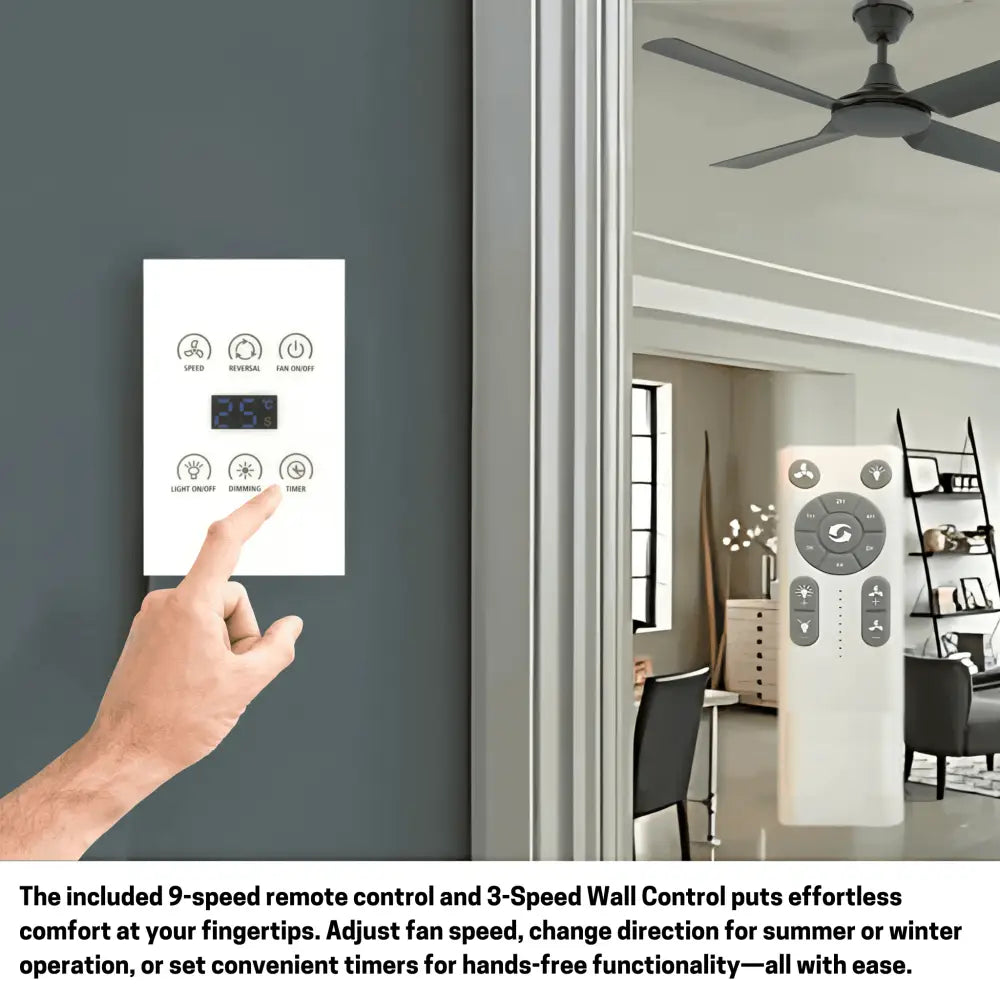 DC Wall Control: Operate your fan with ease using the DC Wall Control. Features include Timer, Light On/Off, Light Dimmer, CCT Changing Function & Ambient Room Temperature display.
