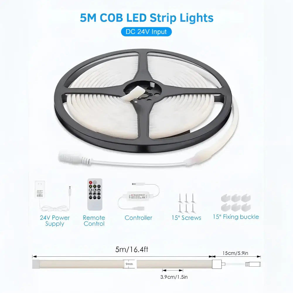5m kit – 1 × 5m COB LED strip, 1 × 24V power supply, 1 × remote controller, 15 fixing clips + screws.
