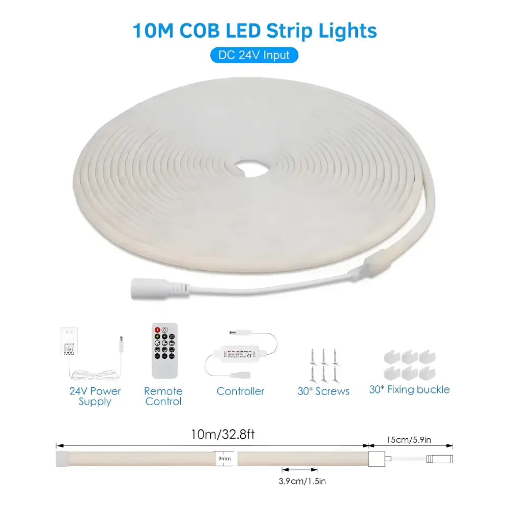 10m kit – 1 × 10m COB LED strip, 1 × 24V power supply, 1 × remote controller, 30 fixing clips + screws.
