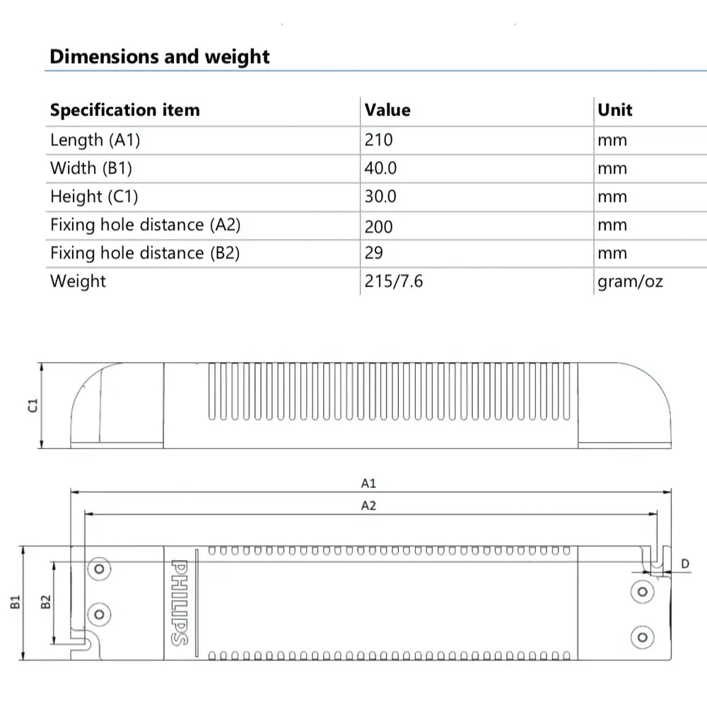 Installation is made simple with screw terminal connectors, and the compact housing (210 × 40 × 30 mm) allows for seamless integration in tight spaces. Engineered by Philips, it complies with California Title 24, is SELV-rated for safety, and backed by a 5-year warranty.